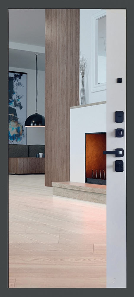 Стальная дверь 3K Матрикс с зеркалом 3/4 предлагается в цвете внутренней панели Белый матовый с 3-мя контурами уплотнения (3 трубчатые) для ещё большей защиты Вашей квартиры от посторонних шумов и запахов, а внутреннее наполнение из минеральной перегеродки Урса надежно уберегут Вас от проникновения холода.